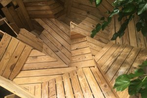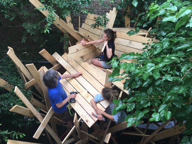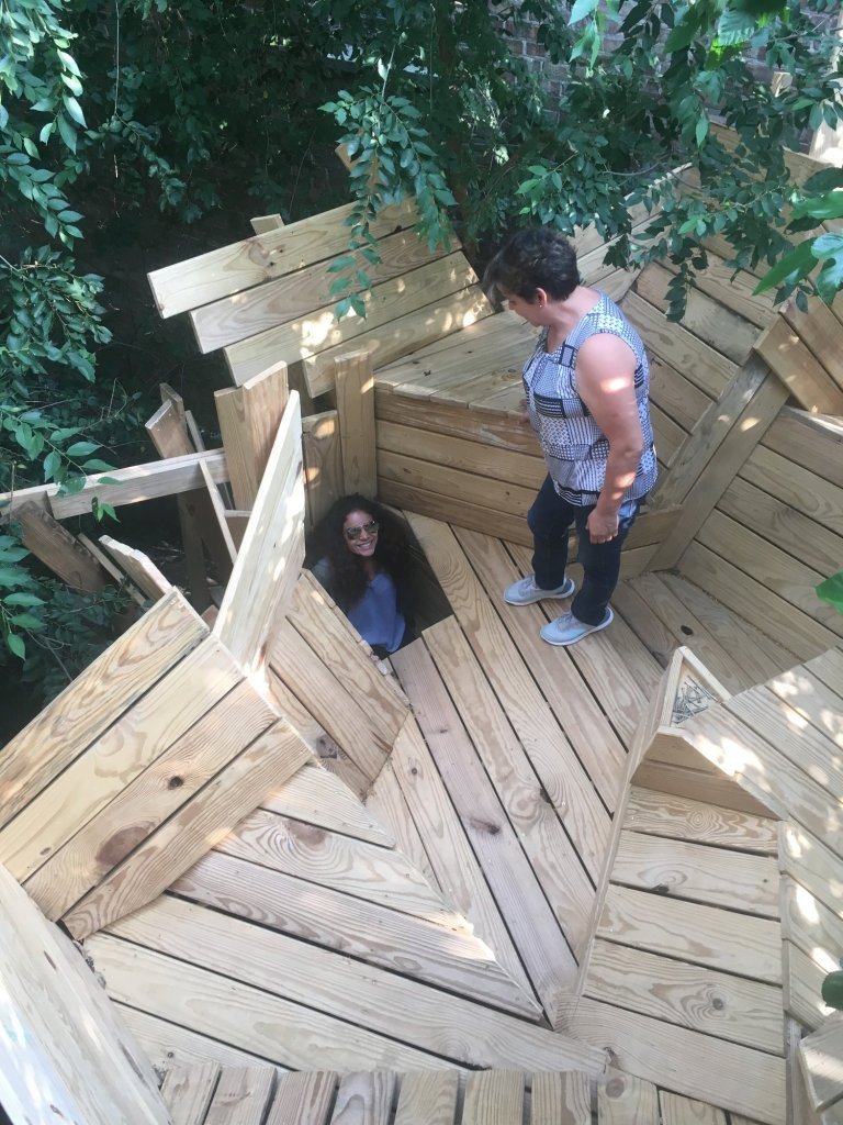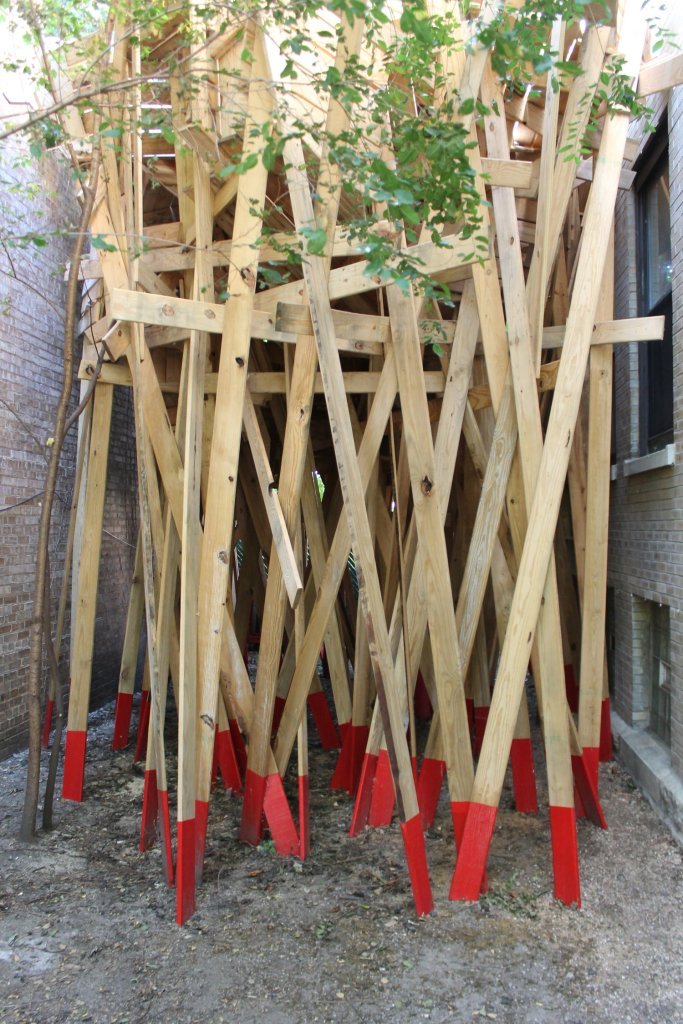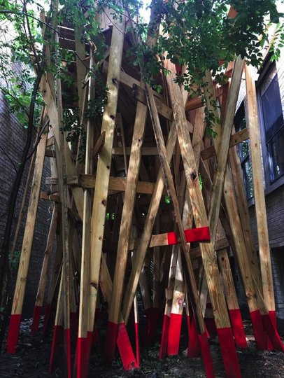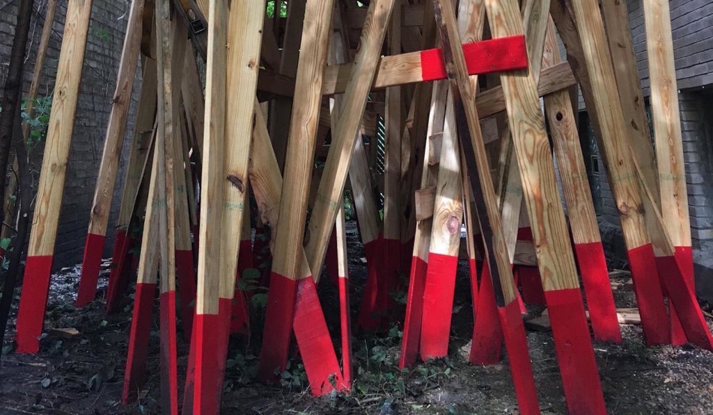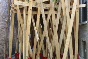 Challenging art, architecture, work, and play, The Chapuisat Brothers’s tree-top In Wood We Trust is entered by crawling through a tunnel inside 6018North. Built entirely of wood, the large invasive structure and exhibition transforms our perception of the space it occupies and the people within it. An anarchitectural intervention, it is a deceptively playful yet dramatic utopian experiment in building community through architecture and art. While the main floor of the structure is in the tree-top, below visitors are invited to physically thread through winding passages and get lost within its intricate maze, funhouse, and collective space. Located between architecture, sculpture, and playground, the Chapuisat Brothers’s work challenges our perceptions of space, movement, and gravity, while questioning distinctions between architecture, art, work, play, and communal exchange. In the process, it posits that the corporeal and convivial pleasure of experiencing art should not be separated from its visual and intellectual components.