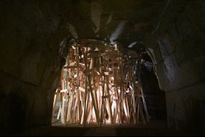 Gregory Chapuisat, représentant de la fratrie éponyme, a baptisé son installation « La Loge », en réponse à l’œuvre de Séverine Hubard « La Salle des Colonnes » installée quelques mètres plus loin. Un nom qui entre parfaitement dans la thématique favorite de l’artiste : l’architecture, l’habitat éphémère, les cabanes labyrinthiques… “La Loge”, c’est une structure monumentale en bois de 7 mètres de hauteur, née d’un assemblage empirique sans verticalité, ni horizontalité, une architecture anarchique, un capharnaüm de planches. Sa réalisation a nécessité 11m3 de bois, 10 000 clous, et 8 semaines de travail pour les cinq membres de la fratrie. “La loge” invite à la découverte, rendant le public acteur de l’œuvre : le visiteur audacieux pourra s’y aventurer au travers d’un passage étriqué reliant le sol de la cave à sa voûte, révélant un cocon suspendu, un nid douillet au cœur des grottes de tuffeau ou une épreuve extrême pour les âmes sensibles : ce qu’on appelle “l’expérience Chapuisat”. « C’est tout l’objectif ! Nous ne faisons pas un travail d’art purement visuel, mais immersif où les visiteurs doivent activer l’œuvre en elle-même. C’est une installation qui est praticable, où il faut participer, s’introduire, grimper et slalomer, entre les planches en bois, pour découvrir et vivre l’œuvre et pour terminer au sommet », explique Gregory Chapuisat.