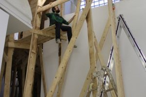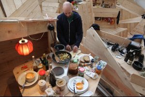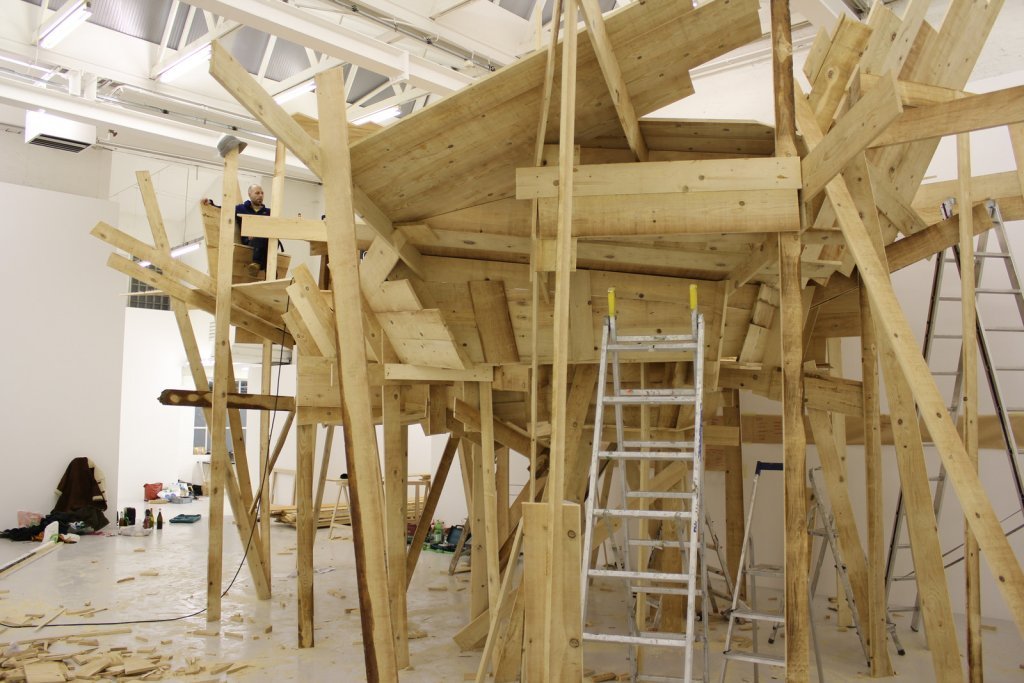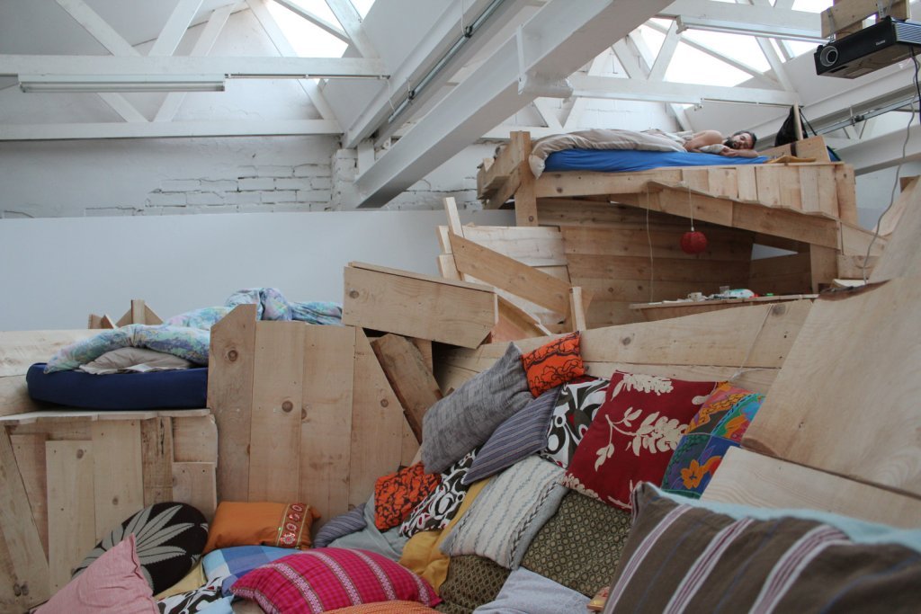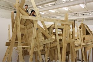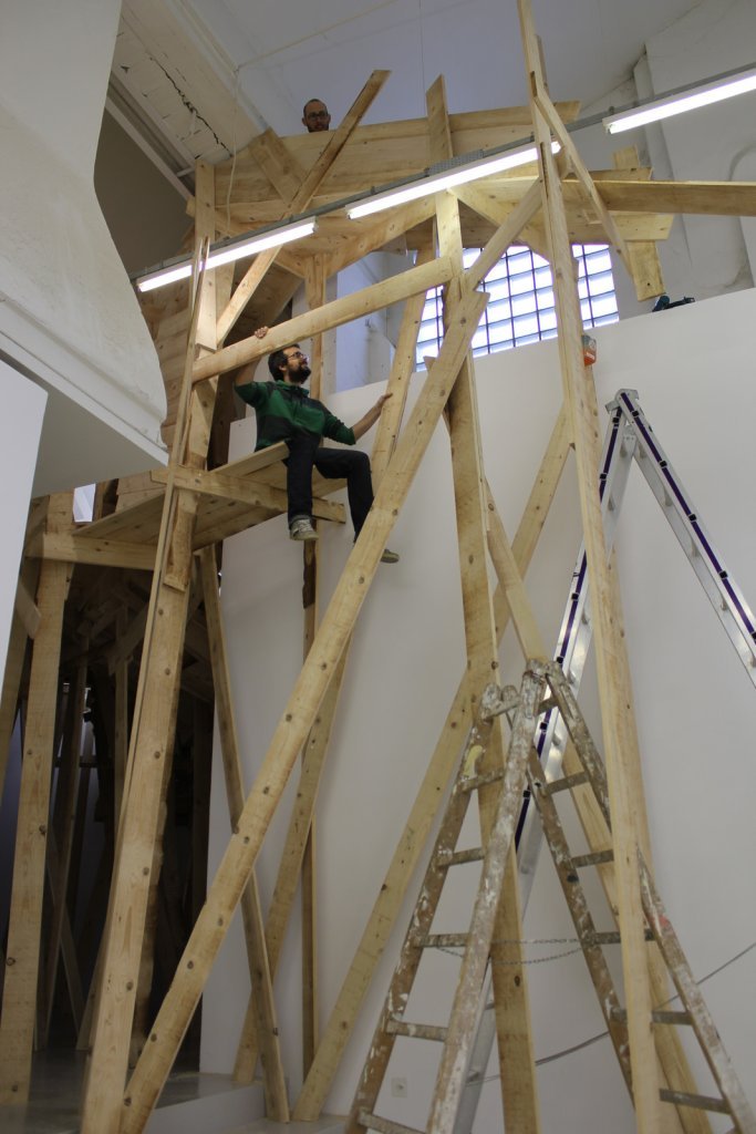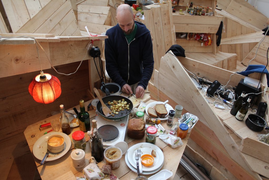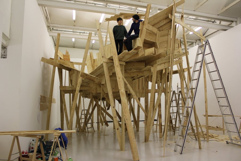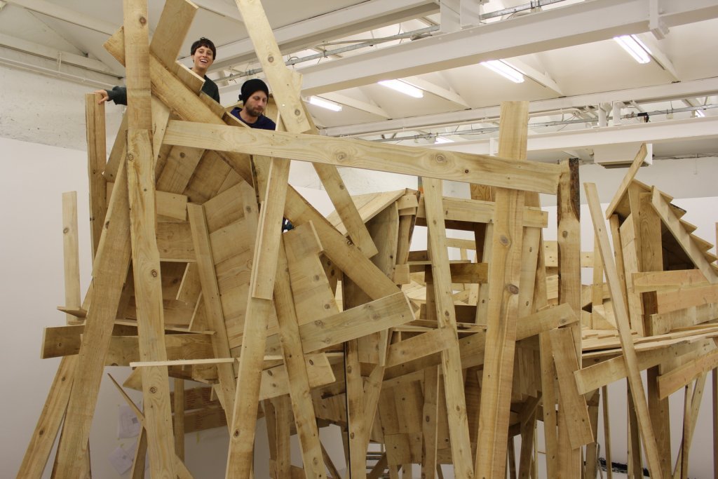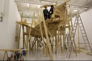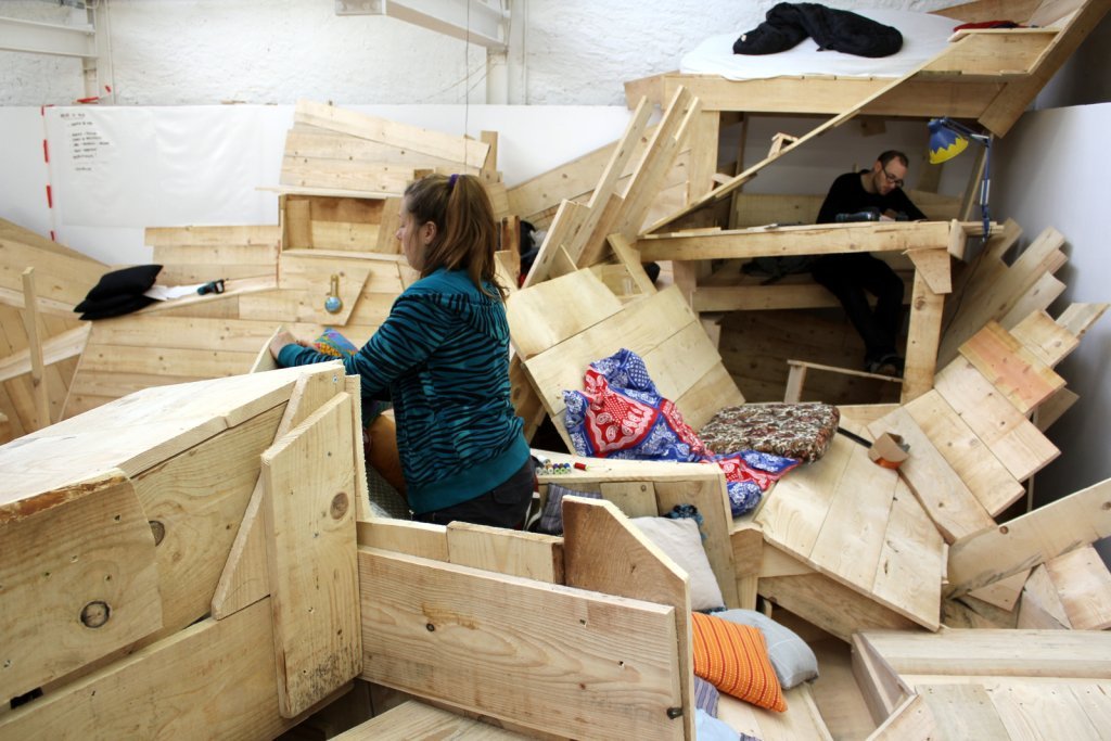 Les frères Chapuisat s’installent au CAN, et ils viennent y habiter sans doute plus qu’y exposer. Avant-post est une prise de position, avant d’être une exposition. Ils s’installent donc au sein de leur installation qui consiste en une construction en bois labyrinthique sur pilotis. De nombreux espaces de vie et de travail y sont créés (chambres à coucher, lieu de réunions, laboratoire, bureaux, salle de détente, carnotzet, etc.). Dès le premier vernissage (mais il s’agit peut-être plutôt d’une pendaison de crémaillère), les Chapuisat vivront dans ces cabanes, ils continueront alors de développer cette structure, tout en travaillant sur deux autres projets. Tout d’abord une publication qui sera en grande partie réalisée sur place, et d’autre part la production d’un multiple qui verra le jour dans l’espace laboratoire. L’espace du CAN sera habité et en constante transformation ; le lieu de vie et de travail se verra lui-même constamment retravaillé.