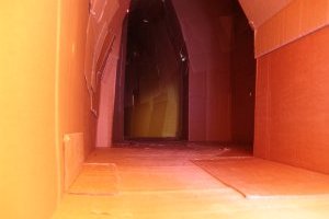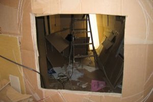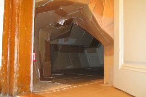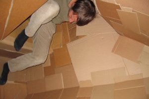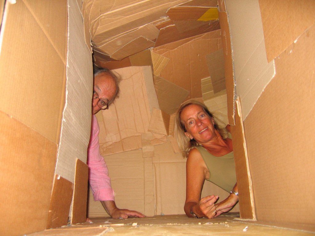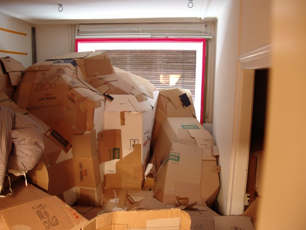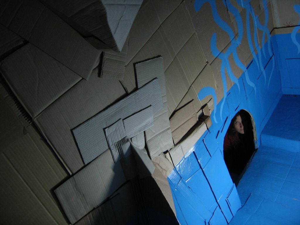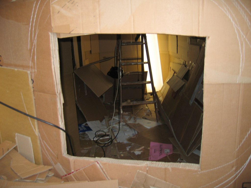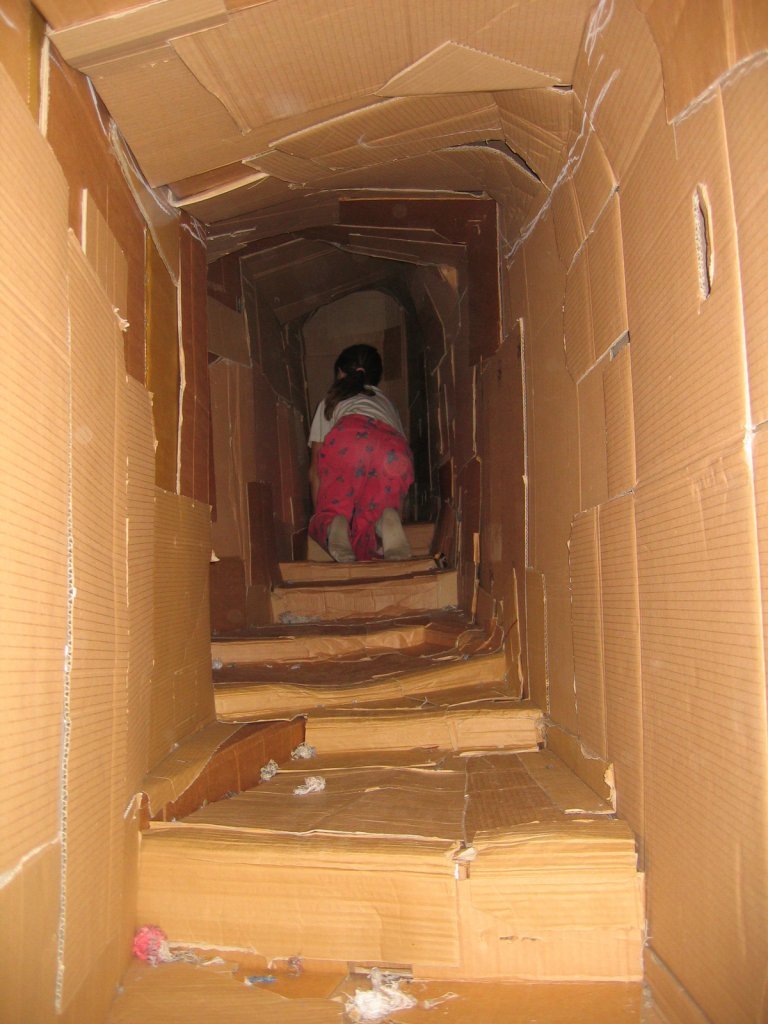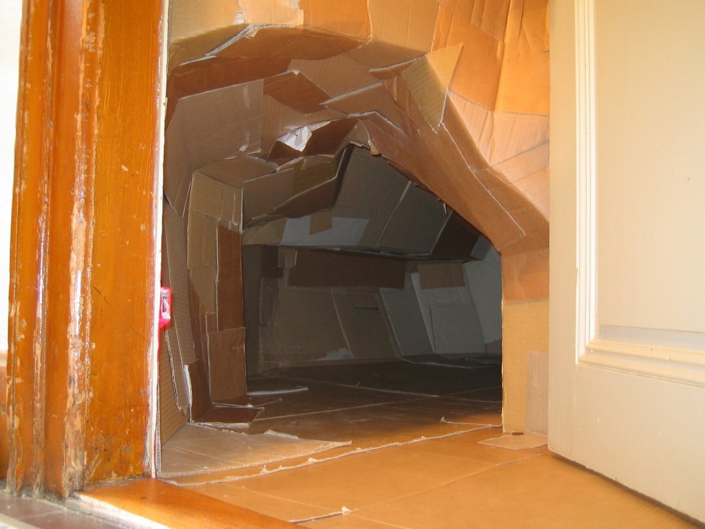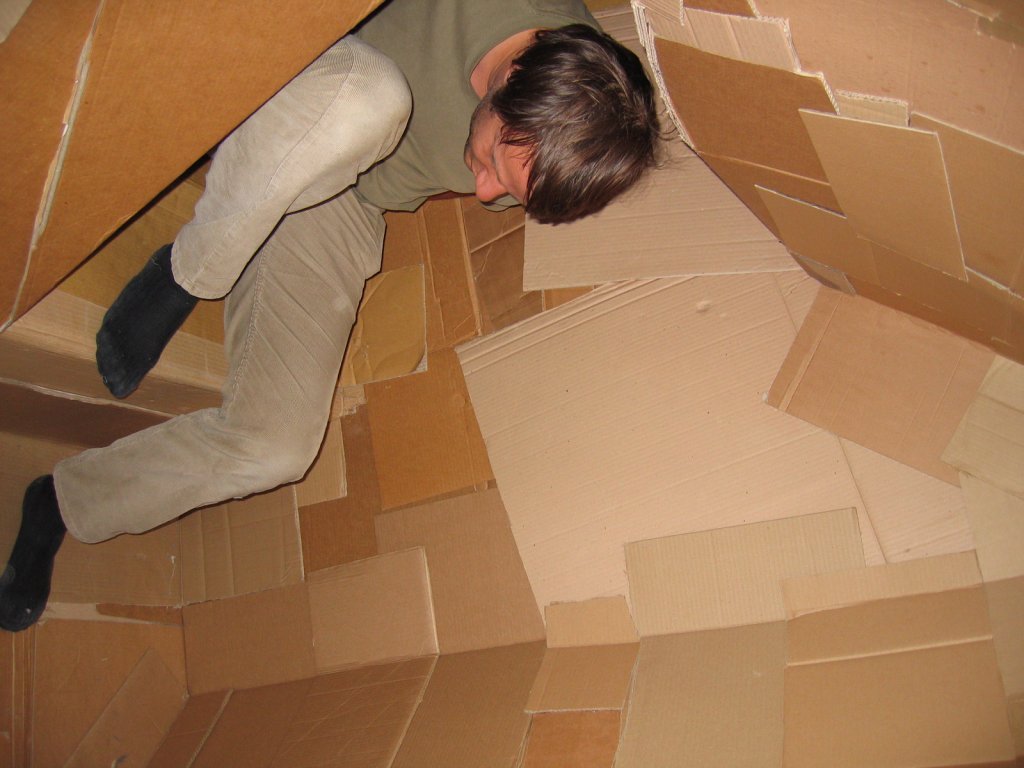 For this project, a 4 room apartment was totally transformed into a hive of cardboard tunnels and chambers. The entranceway into the exhibition opens only halfway, confronting visitors with a wall of cardboard. At the base of the wall is a small opening where they must get down on all fours before crawling into the depths of the construction. Once inside, total blackness compels them to grope around, exploring the inside of the labyrinth, leaving all notion of space and time outside. This requires visitors to let go and trust in their senses. During the journey, they encounters dead-ends, holes, inclines and hollows which trigger contrasting emotions. They undergo a subjective experience far from everyday reality, during which they rediscover a combination of childlike fear and excitement.