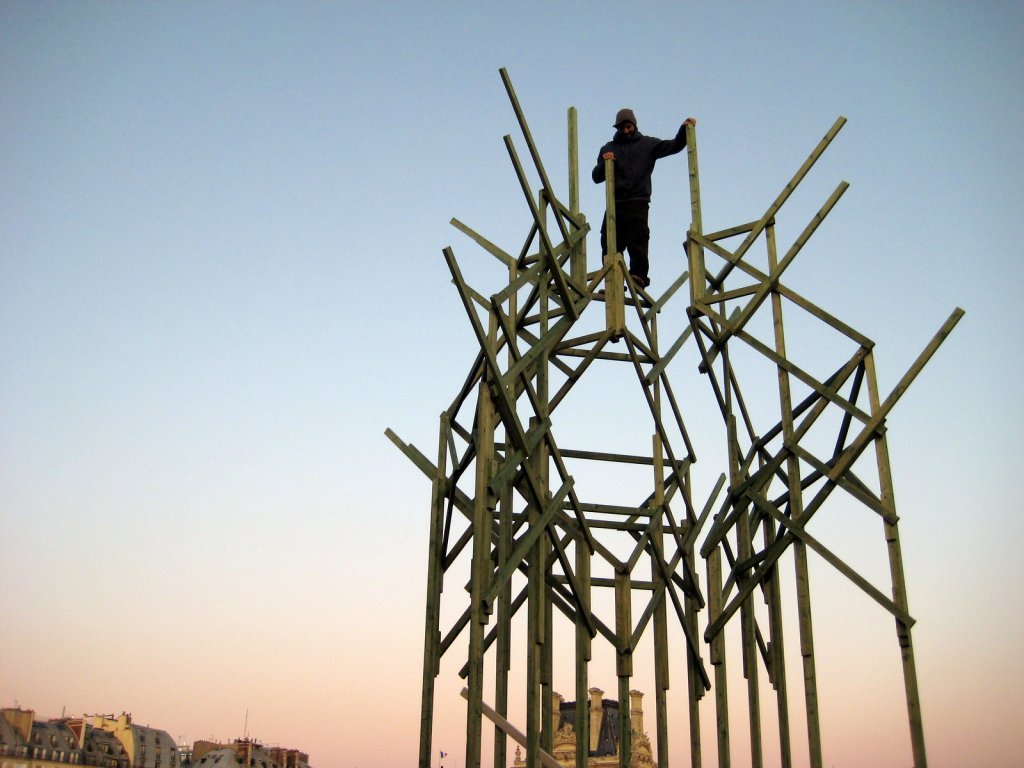 For FIAC 2009, We have created an elevated wooden structure where Laurent Tixador have lived for the duration of the exhibition. The structure was moving as he moved, much like the worms that live in the Mexican jumping beans.