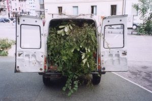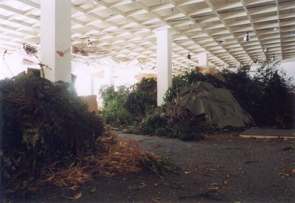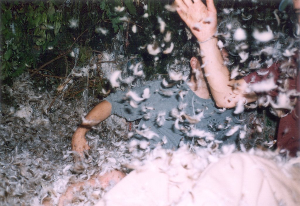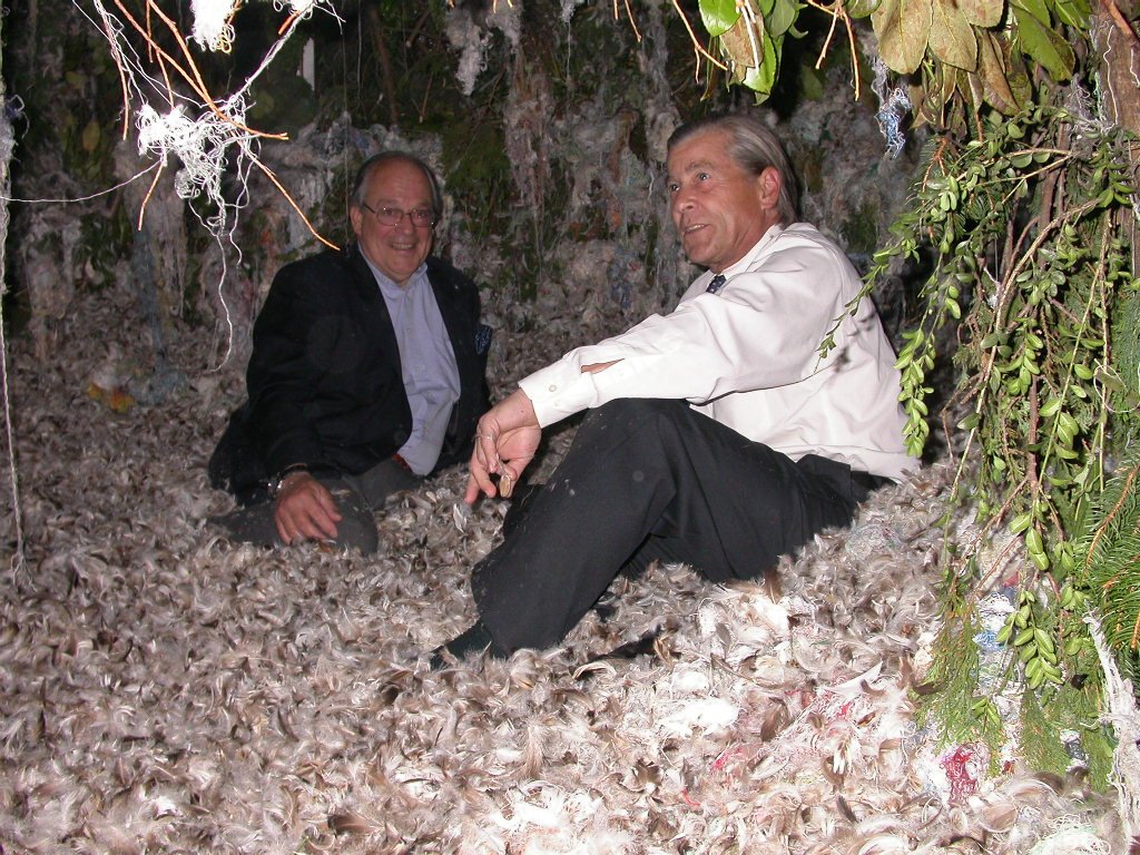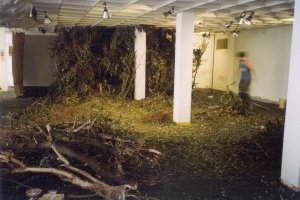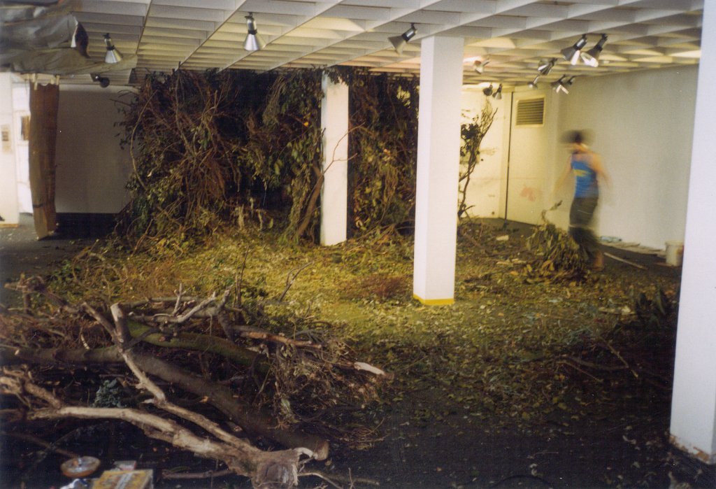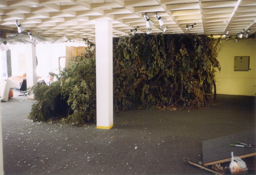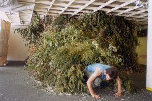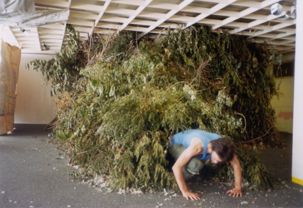 This installation was on show at the Espace A-zéro collective exhibition. It resembles an oversized nest of branches, a leafy, entangled mass arranged in such a way as to form walls of sufficient thickness that they blot out noise and light penetration. A heady aroma of diverse woodland fragrances permeates the inner enclosure, whilst a narrow tunnel forms the only entranceway, forcing visitors to get on all fours to crawl inside and burrow into the darkness...once immured within, a dimly-lit mass of downy feathers and clustered fibres confronts the explorer, arousing a primordial sensation of bestiality intermingled with fairytale enchantment. The creation engulfs visitors, forcing them to question their own modernity; it also offers a perception of nature which is both hostile and protective.