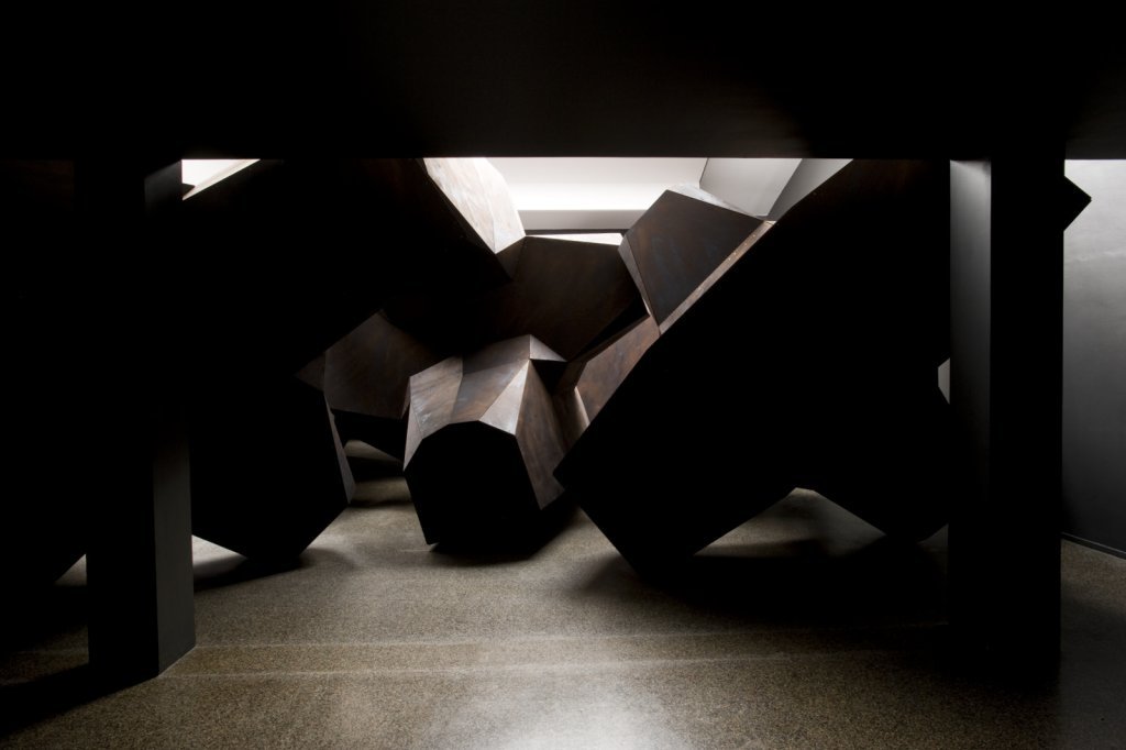 Dans son essai Bunker Archéologie daté de 1975, le penseur Paul Virilio raconte comment il découvrit, pendant l’été 1945, sur les plages interdites ou minées du littoral océanique, les masses grises des blockhaus installés par les armées allemandes le long du mur de l’Atlantique. Etrangement, c’est un peu de cette expérience, brutale et fascinante, qui s’offre à l’étage du Centre culturel suisse, quand on découvre les masses compactes, géométriques, à l’allure cuirassée, qui encombrent l’espace. Car c’est un paysage dur, noir, négatif et envahissant qui s’impose à nos yeux.