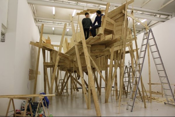 Unter dem Titel "Destruction créatrice" (schöpferische Zerstörung) schaffen Cyril und Gregory Chapuisat für die Ausstellung im Wartesaal eine raumsprengende und mehrere Etagen umfassende Installation. Im Ausstellungsraum entsteht ein neuer organischer Körper, der aus unterschiedlichsten Perspektiven wahrgenommen werden kann. (…)